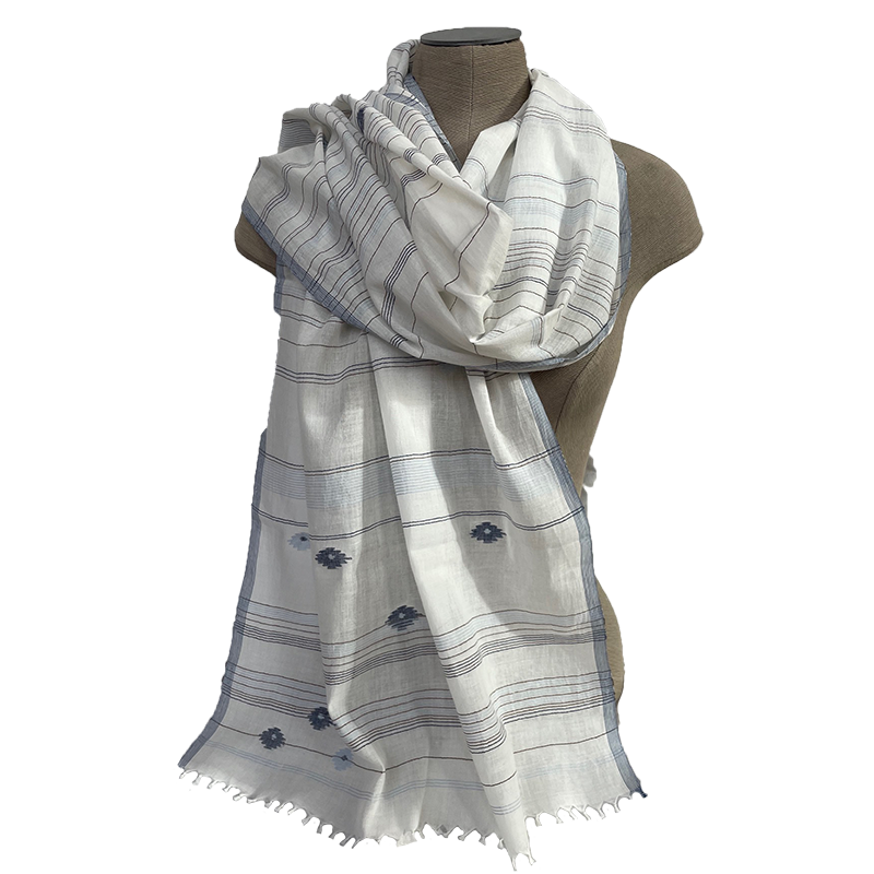 100% katoen, 50x180cmDeze Jamdani shawls zijn van een zachte katoen. Het patroon wordt tijdens het weven met de hand ingelegd.
